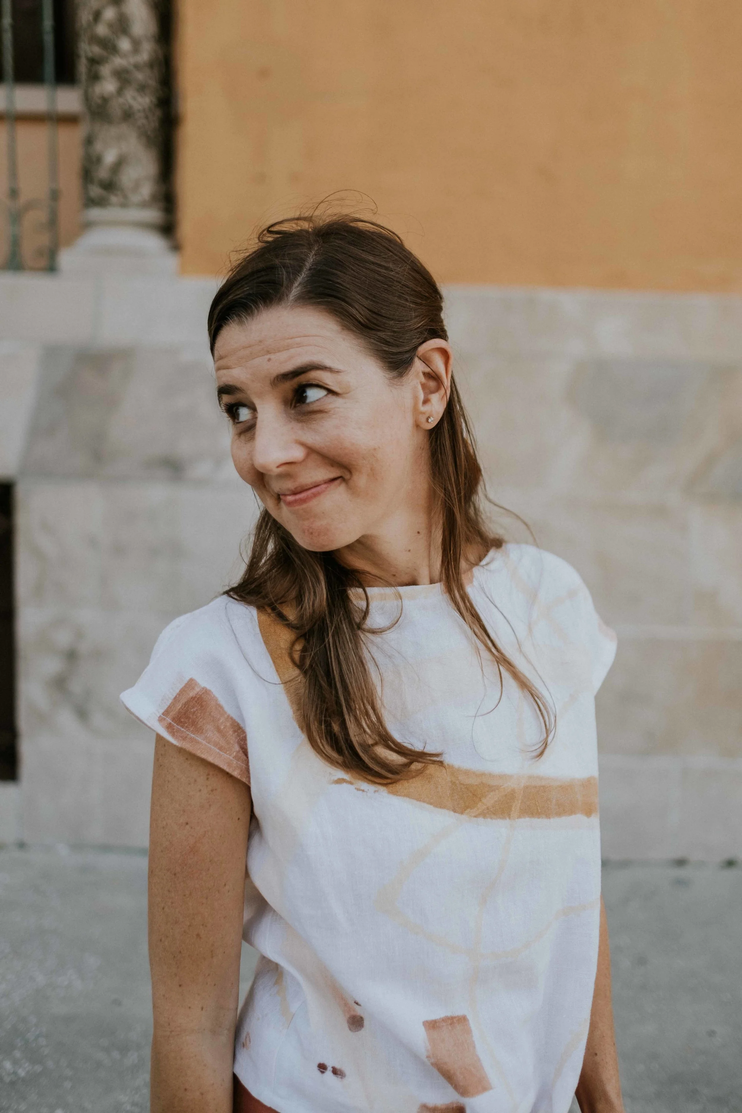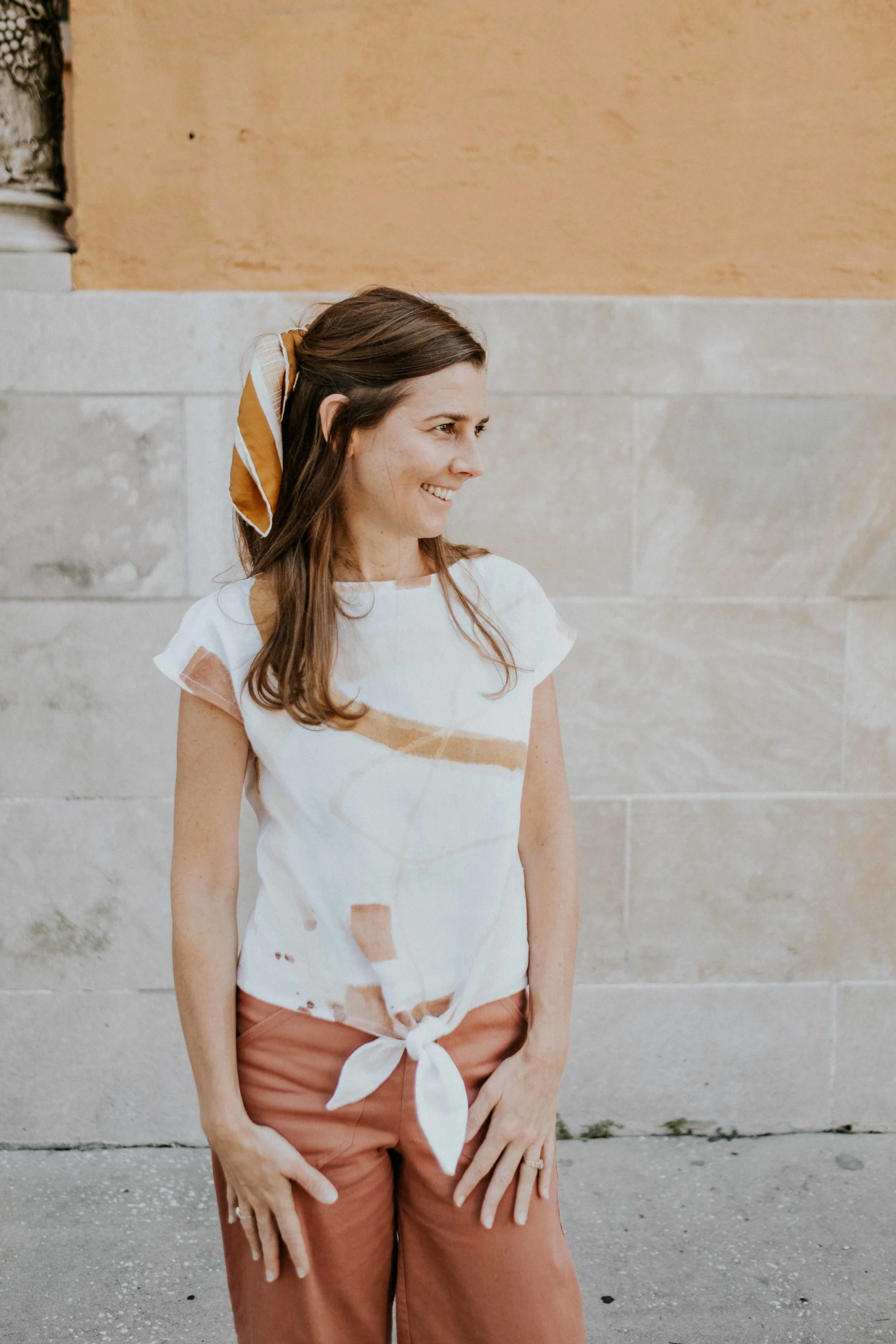 That’s my Mom (yep, is she not the cutest ever?!). She’s modeling the Madeleine Tie Top in the linen that I hand-painted! Only 3 of these tops available in the shop until they’re sold out!