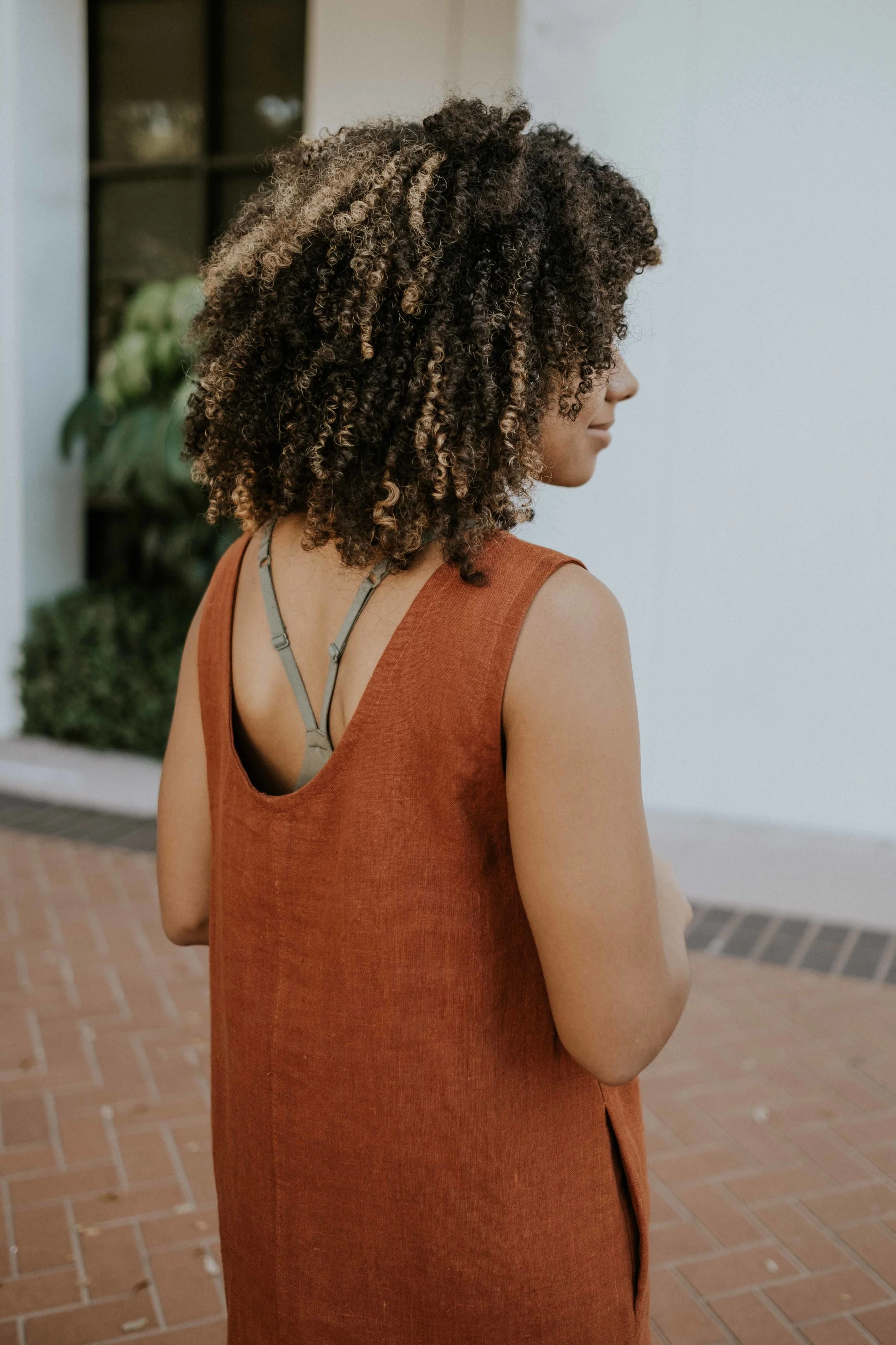 Solie modeling the Elinor Dress Scoop Back Dress featured in rust linen