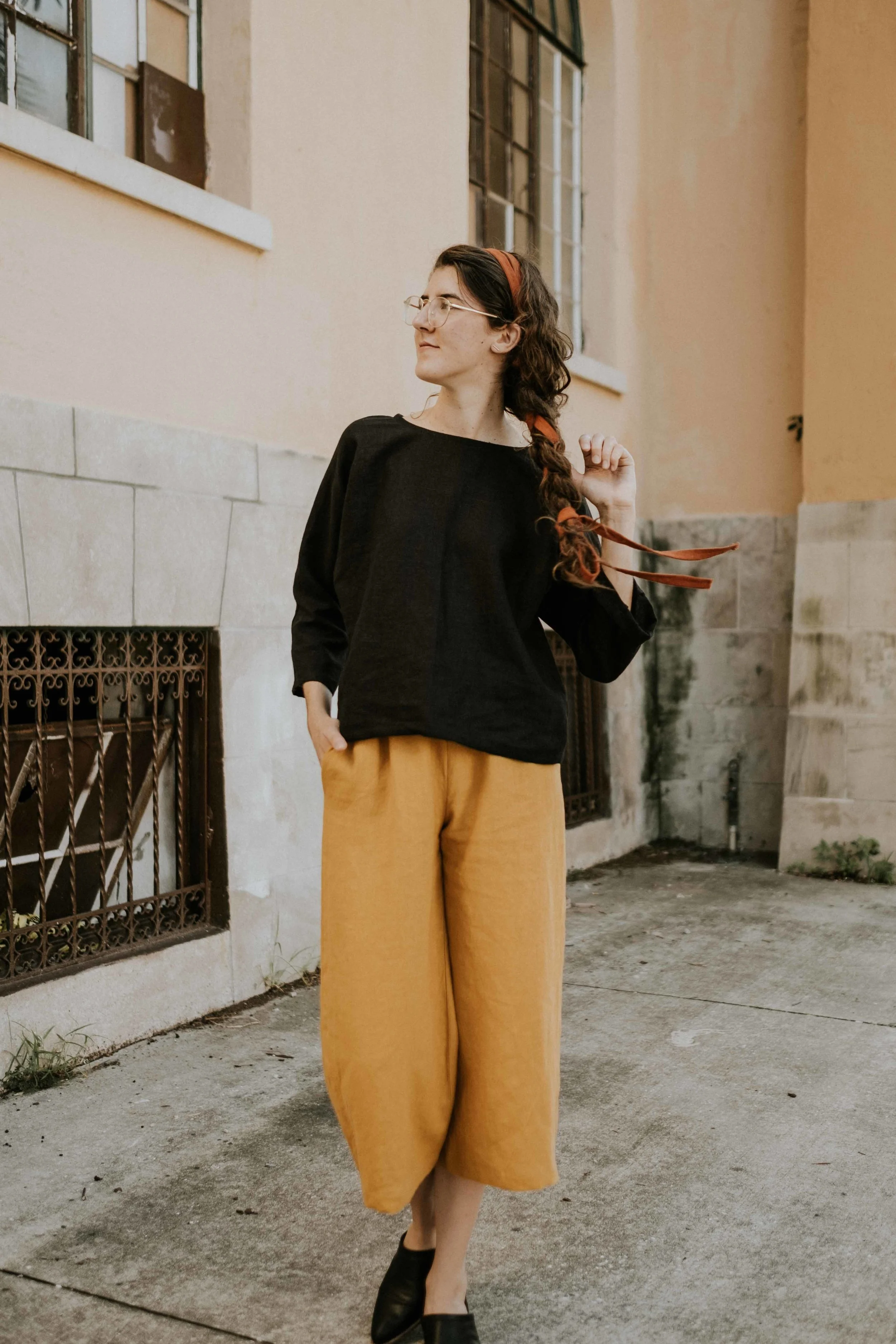 Amanda modeling the Gabriella Three-Quarter Sleeve Top in black linen and the Gloria Wide Leg Pant in golden linen