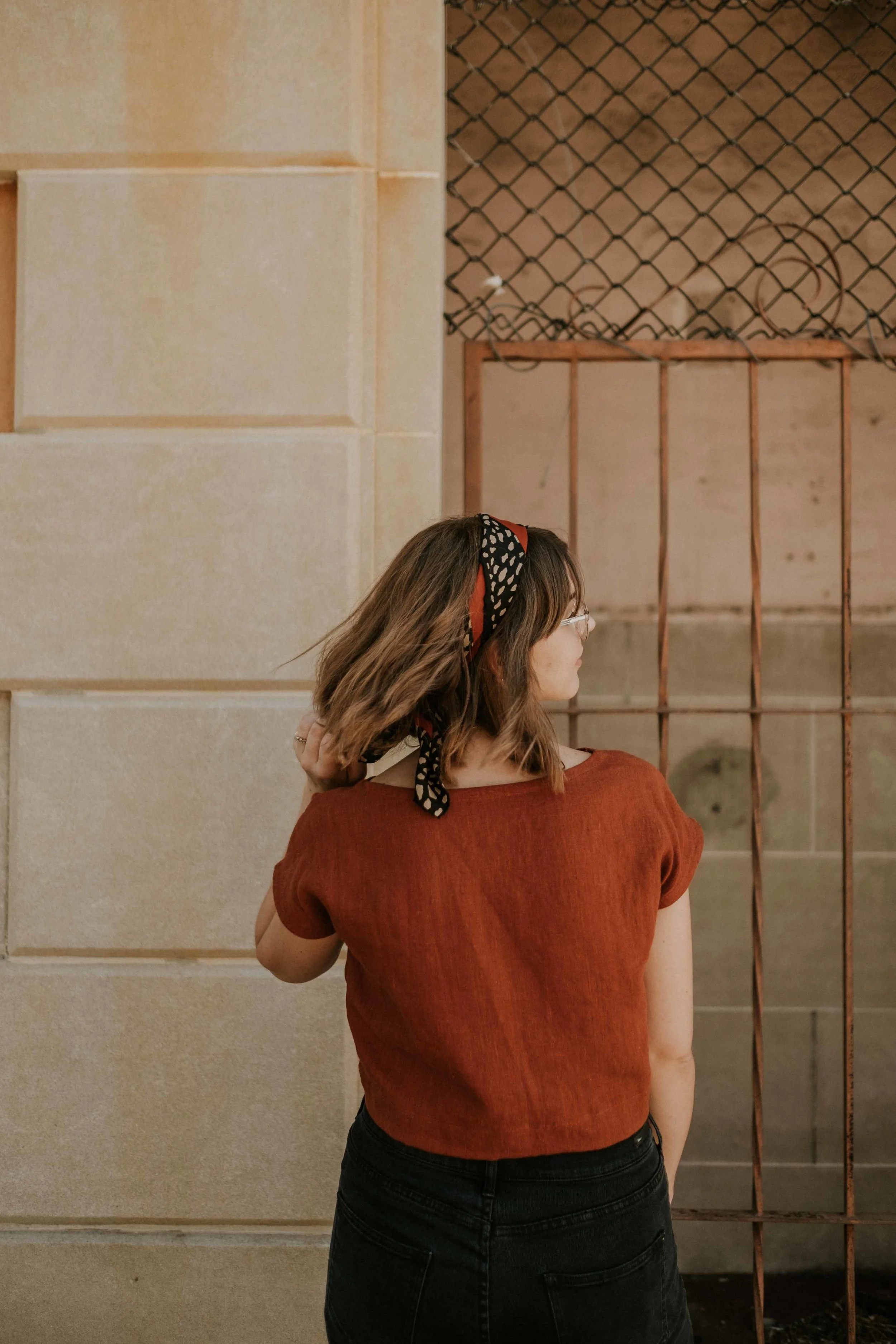 Anna (hi, hello) modeling the Madeline Tie Crop Top featured in rust linen