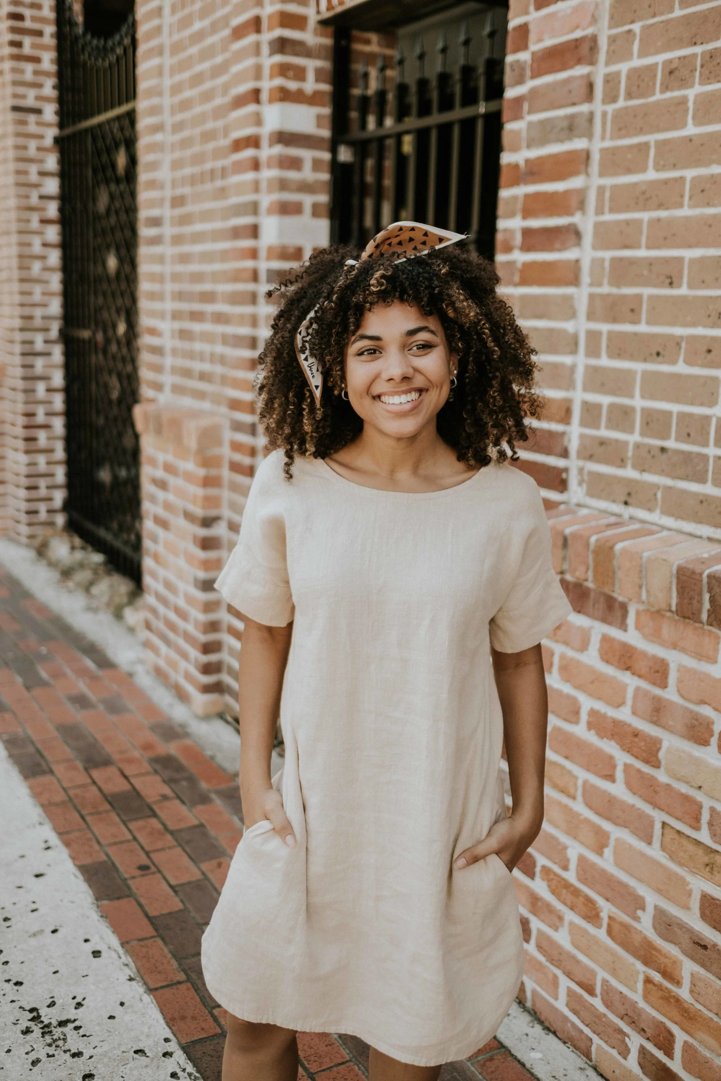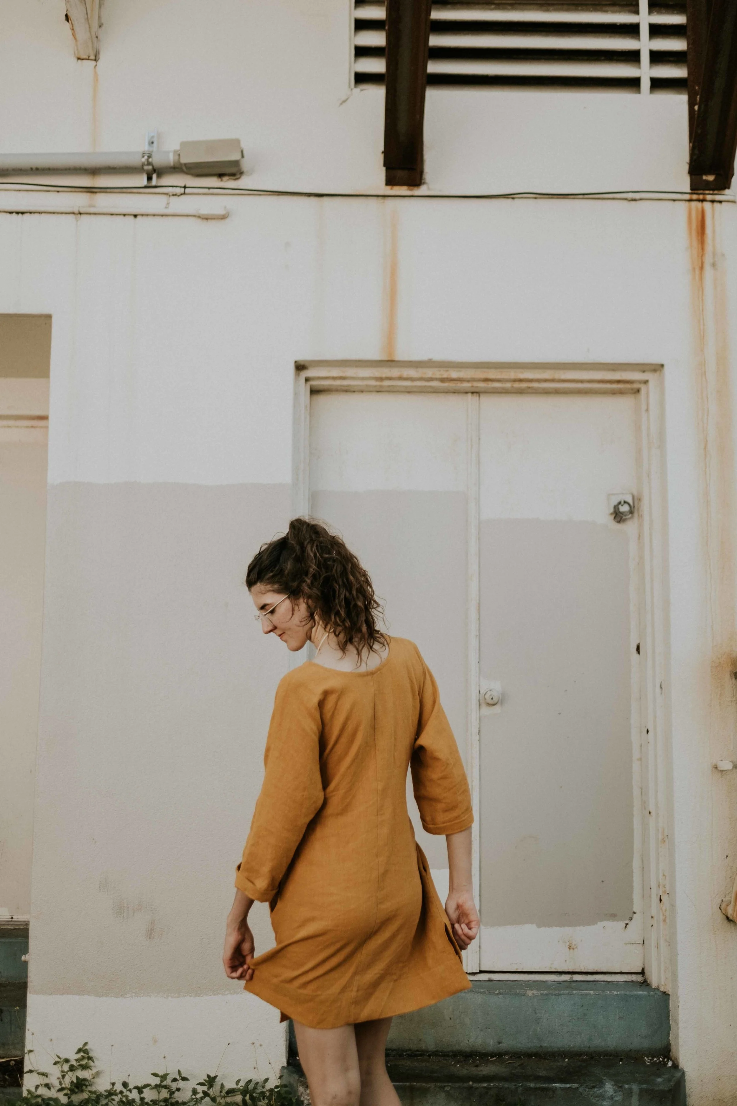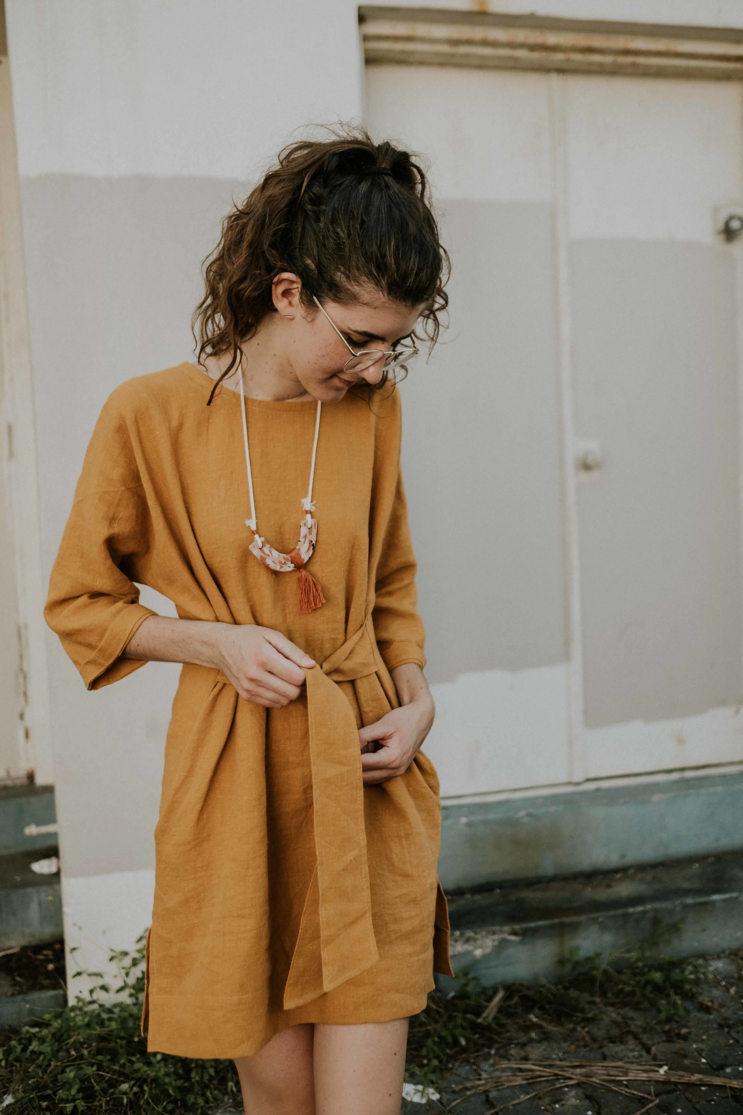 Amanda modeling the Gabriella Tie Dress featured in golden linen (my personal favorite!)