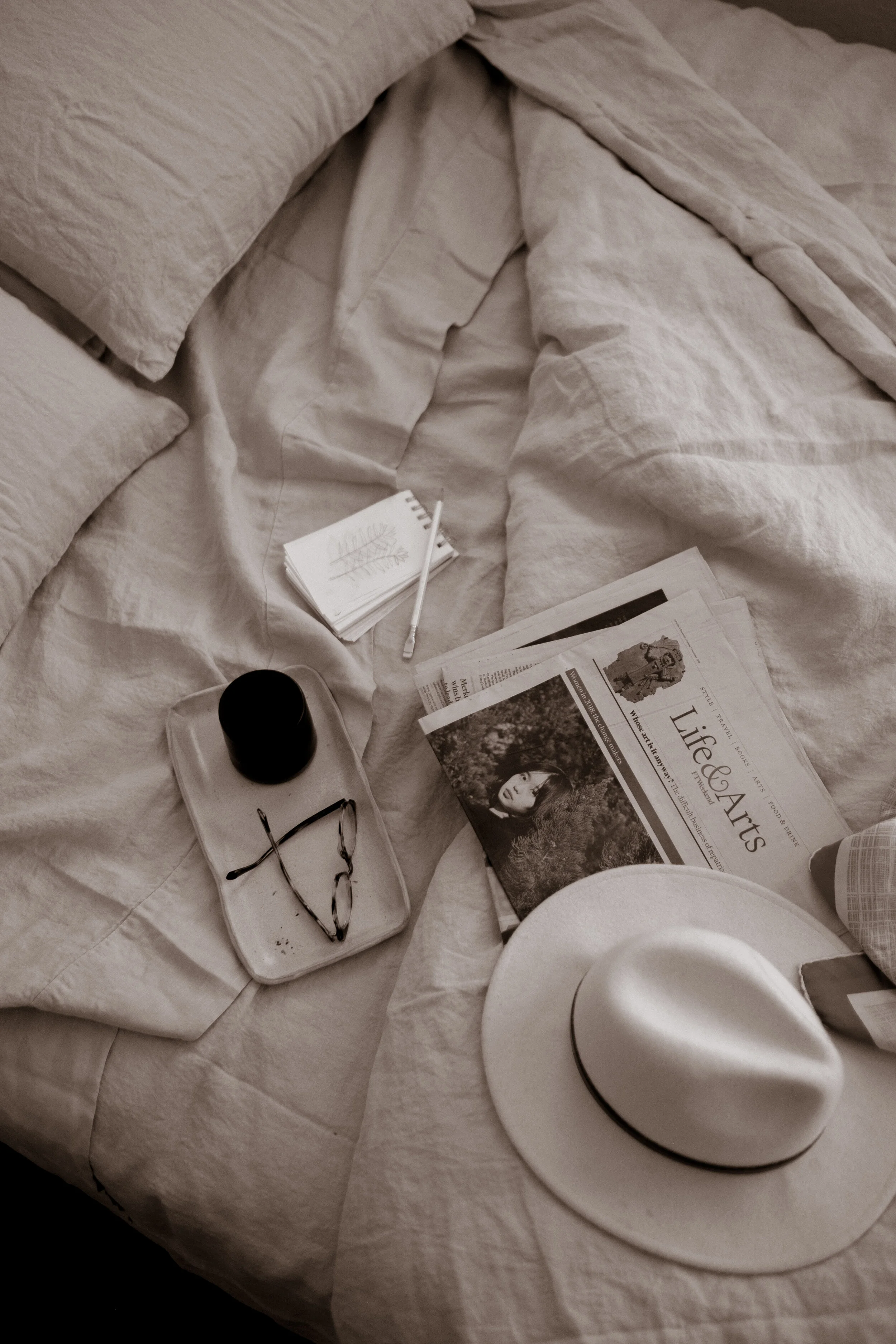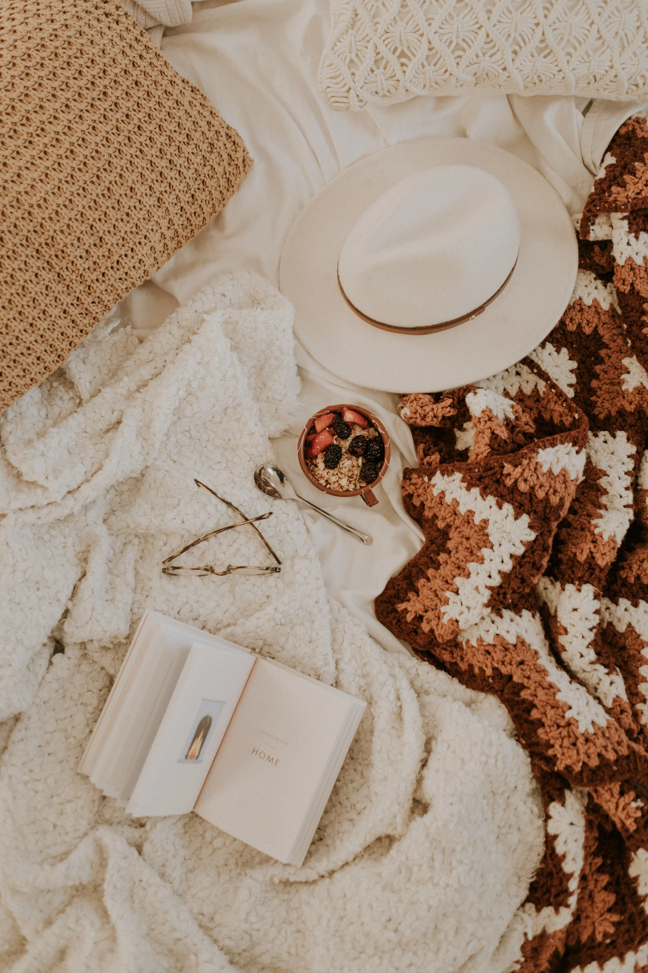 I love styling cozy scenes on my bed because there’s an effortless story to be told in this location, with lots of peaceful vibes. I always make sure to mess up the covers just a bit to create some movement and variety in a photo, and to include a hard surface under any coffee or tea so I don’t spill it on my sheets by accident!