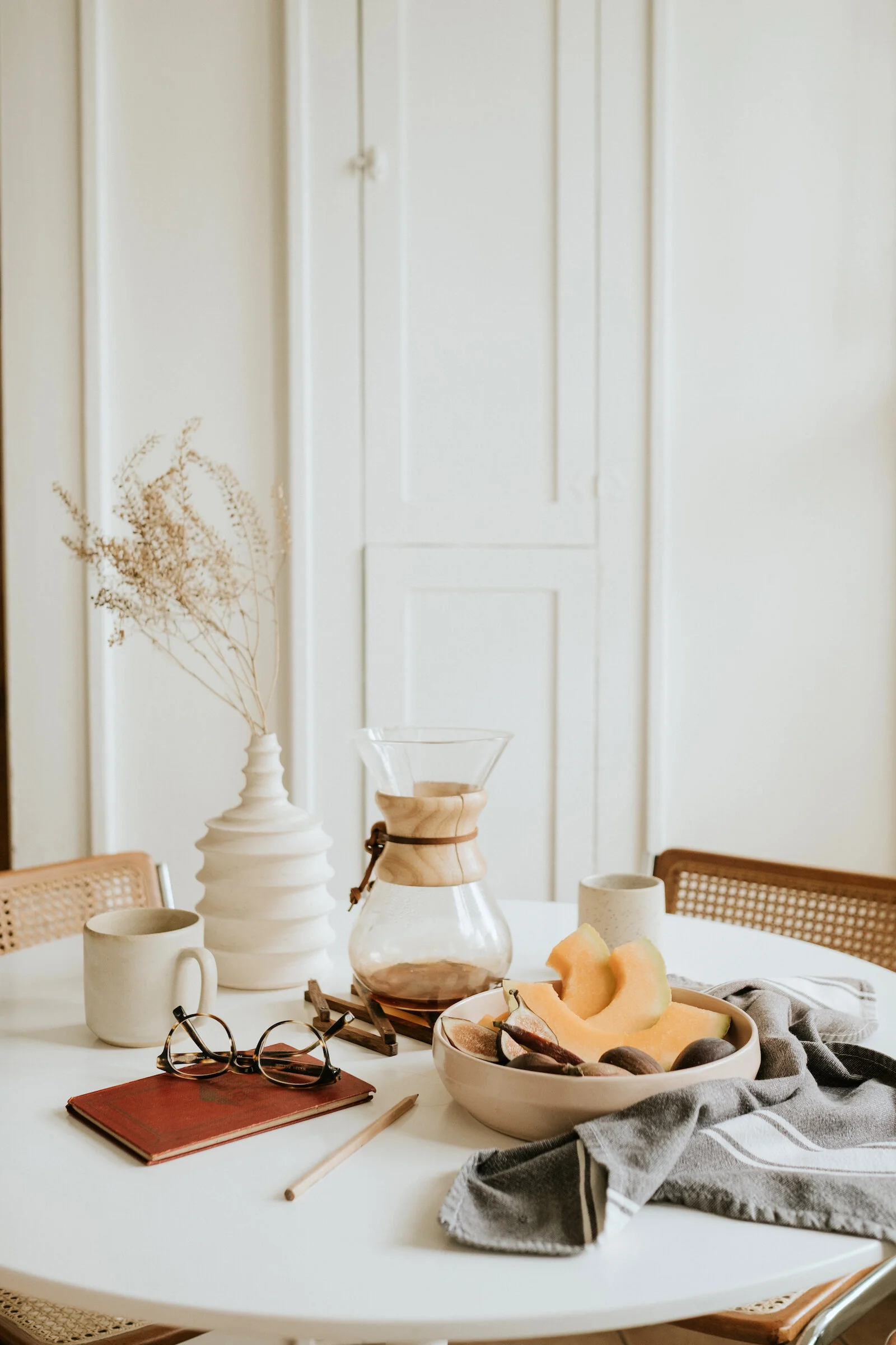 My personal desk-alternative is my kitchen table… so I find myself styling a lot of photos here! Sometimes I shoot at an angle to feature my dining chairs and highlight the scenery, and sometimes I use it for the blank, clean surface. I almost always incorporate some fruit when styling on my kitchen table (either on their own, or in a neutral dish) because I love the pop of color that it gives to my photos.