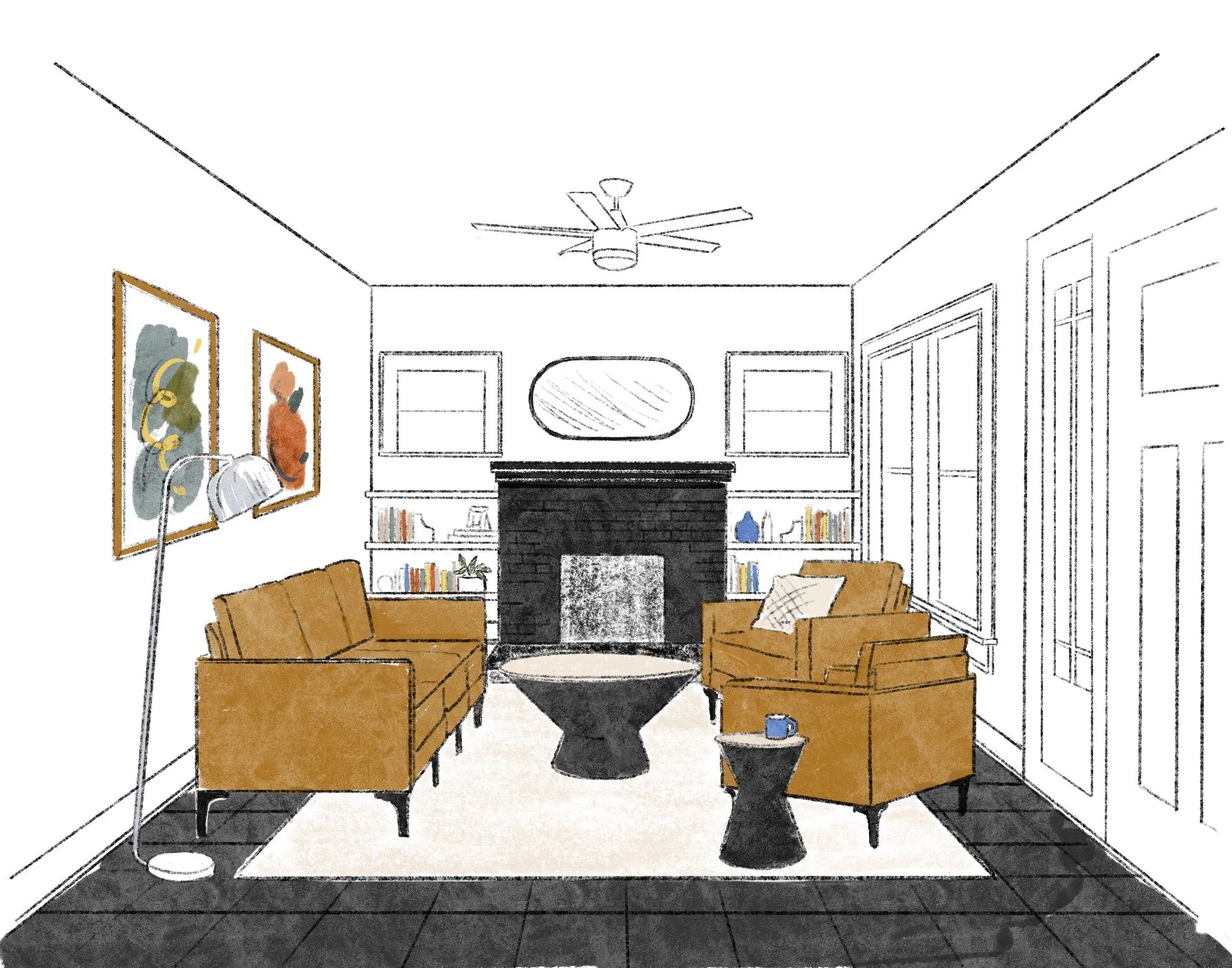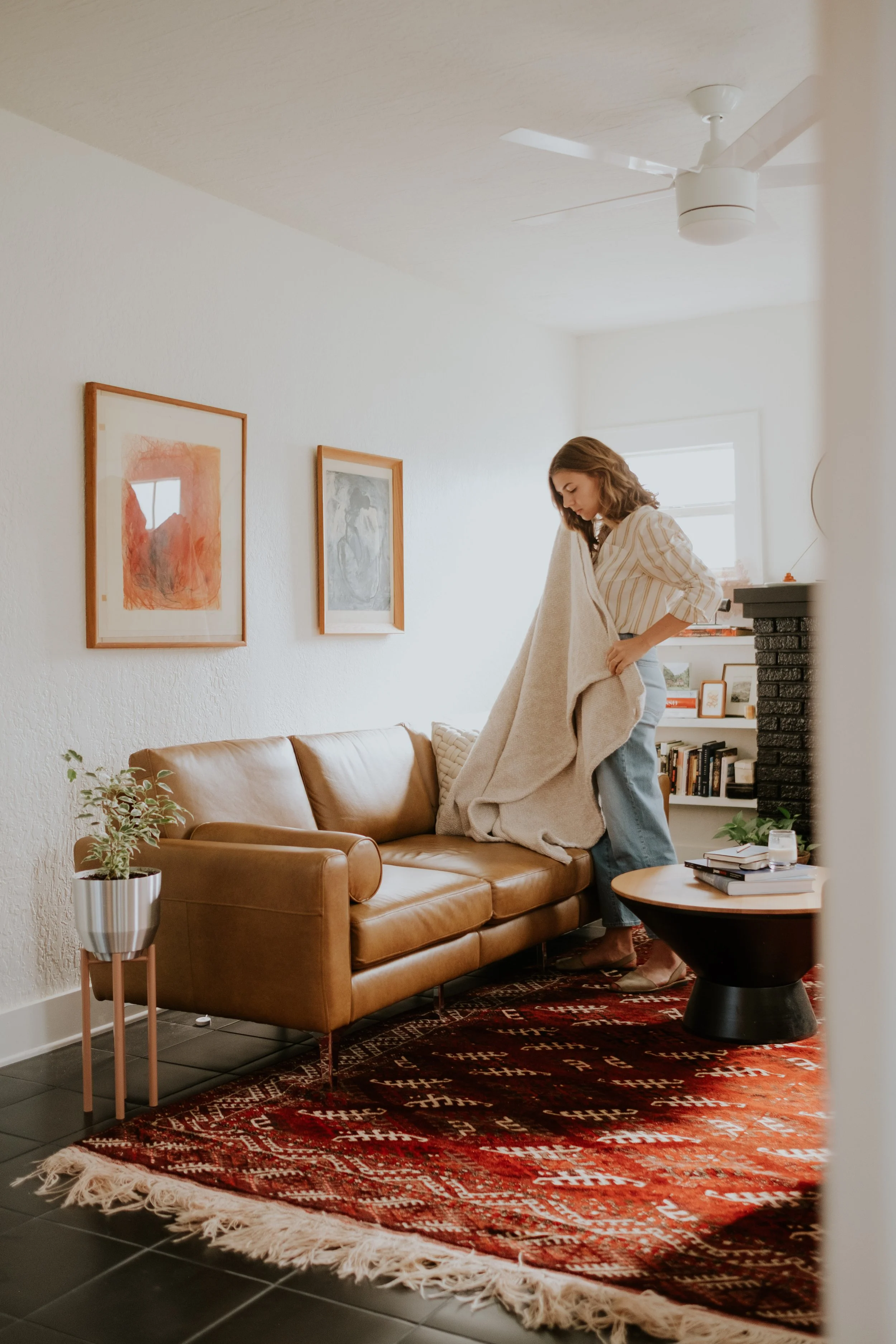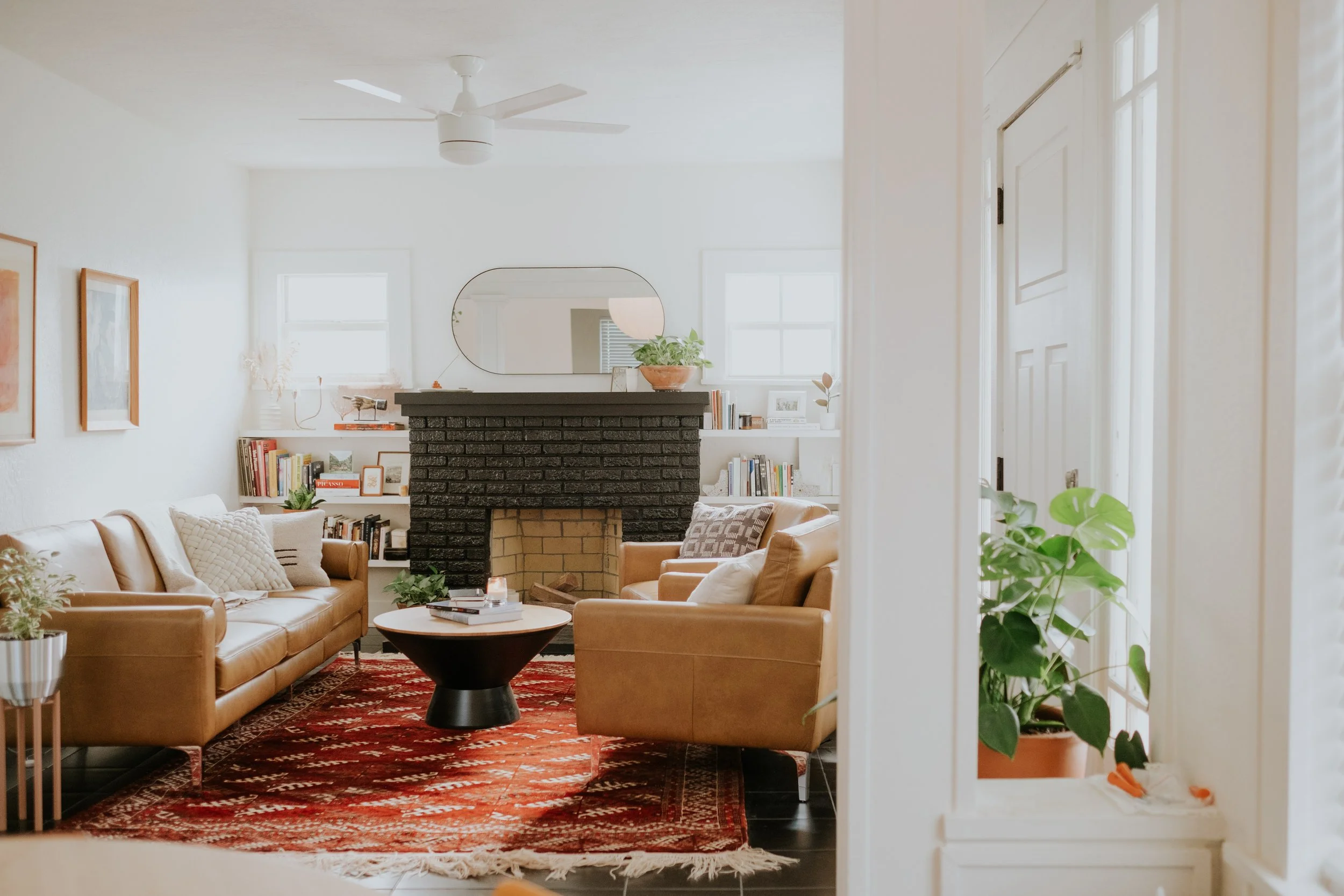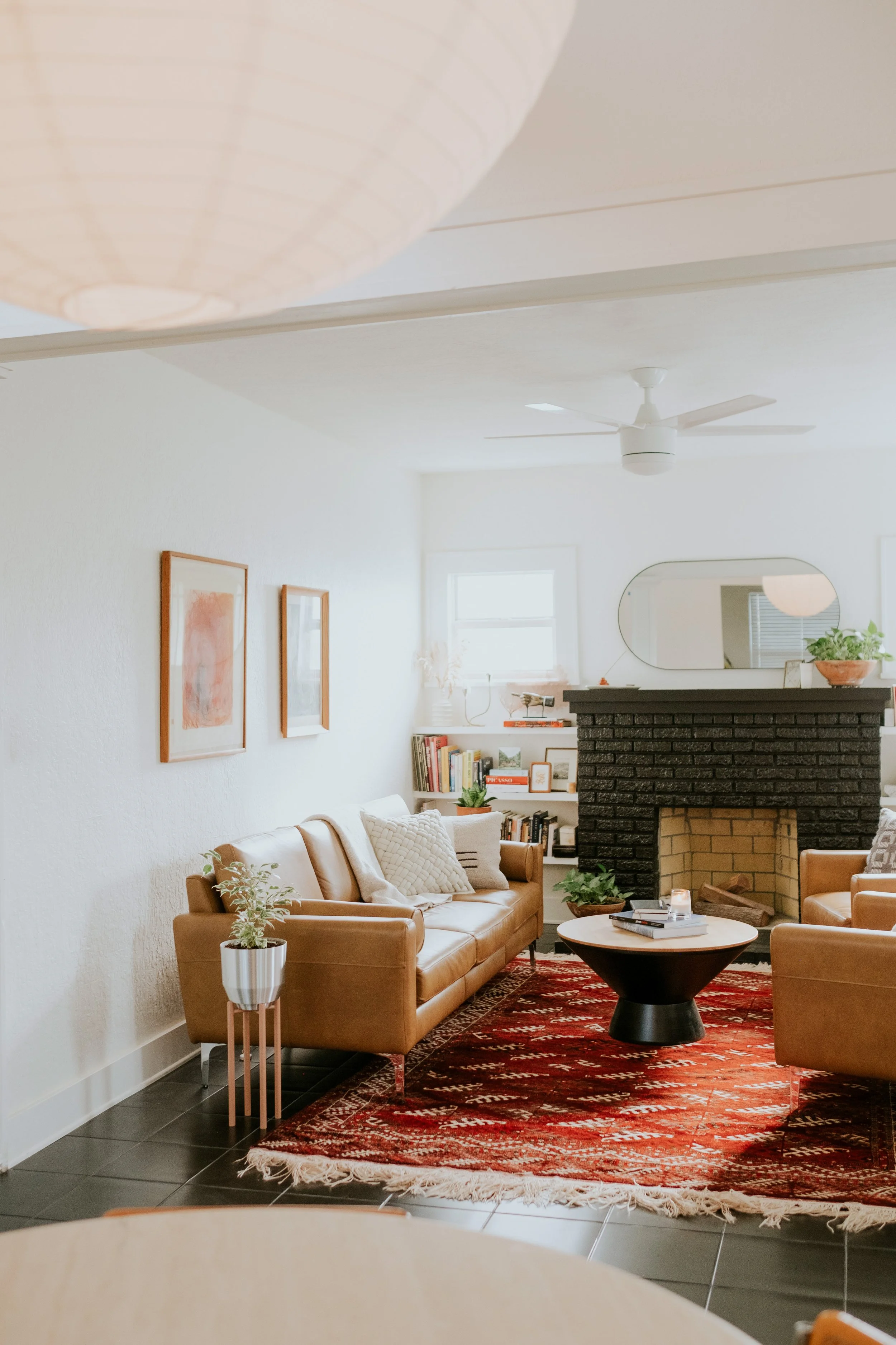 For the design of this room, we wanted the style to feel modern and clean, yet welcoming and cozy with a subtle Florida bungalow vibe. We brightened up the space with some white walls and made our fireplace pop with bold black paint. We added warmth and comfort to the room with our gorgeous leather sofas from Burrow (which we’re obsessed with to this day) and looked for ways to infuse our creative personalities into the space with pops of color from our rug, plants, and artwork. We wanted the items on our shelves to tell a story about our relationship, personal interests, and travels, and we love how these elements make the space feel very “us”.